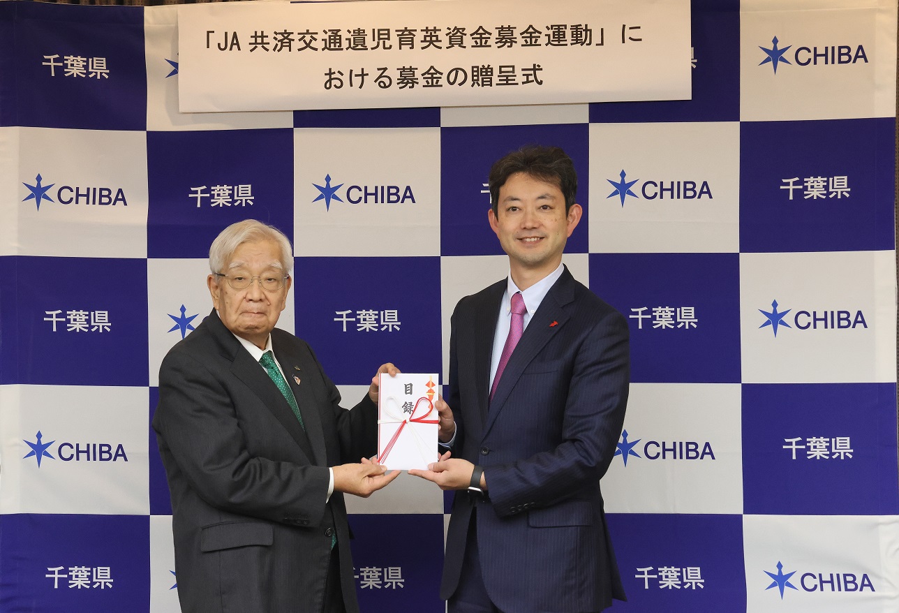 12月25日、県下17JAの窓口や街頭募金などで集めた交通遺児向けの支援募金約390万円を、熊谷俊人知事が会長を務める官民組織「千葉県交通安全対策推進委員会」に寄贈しました。